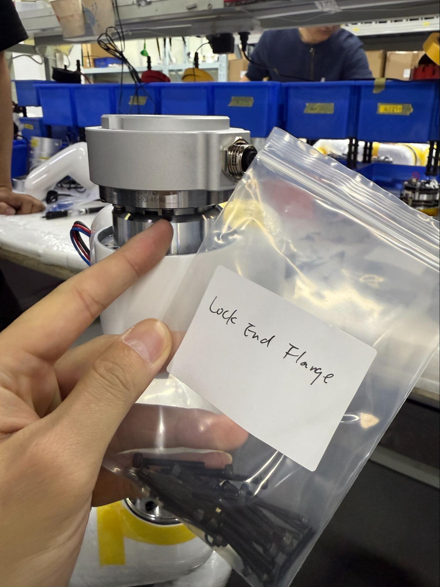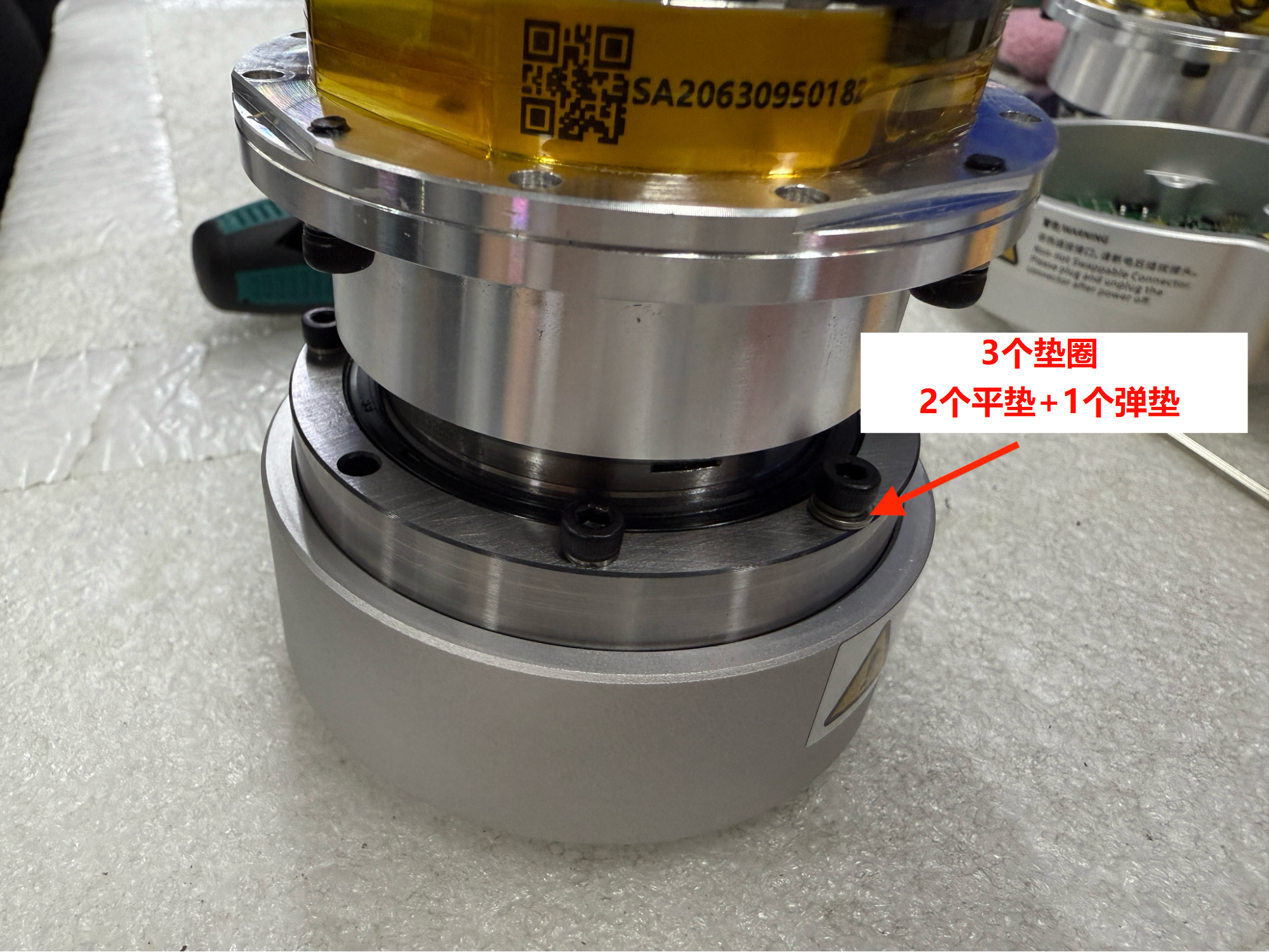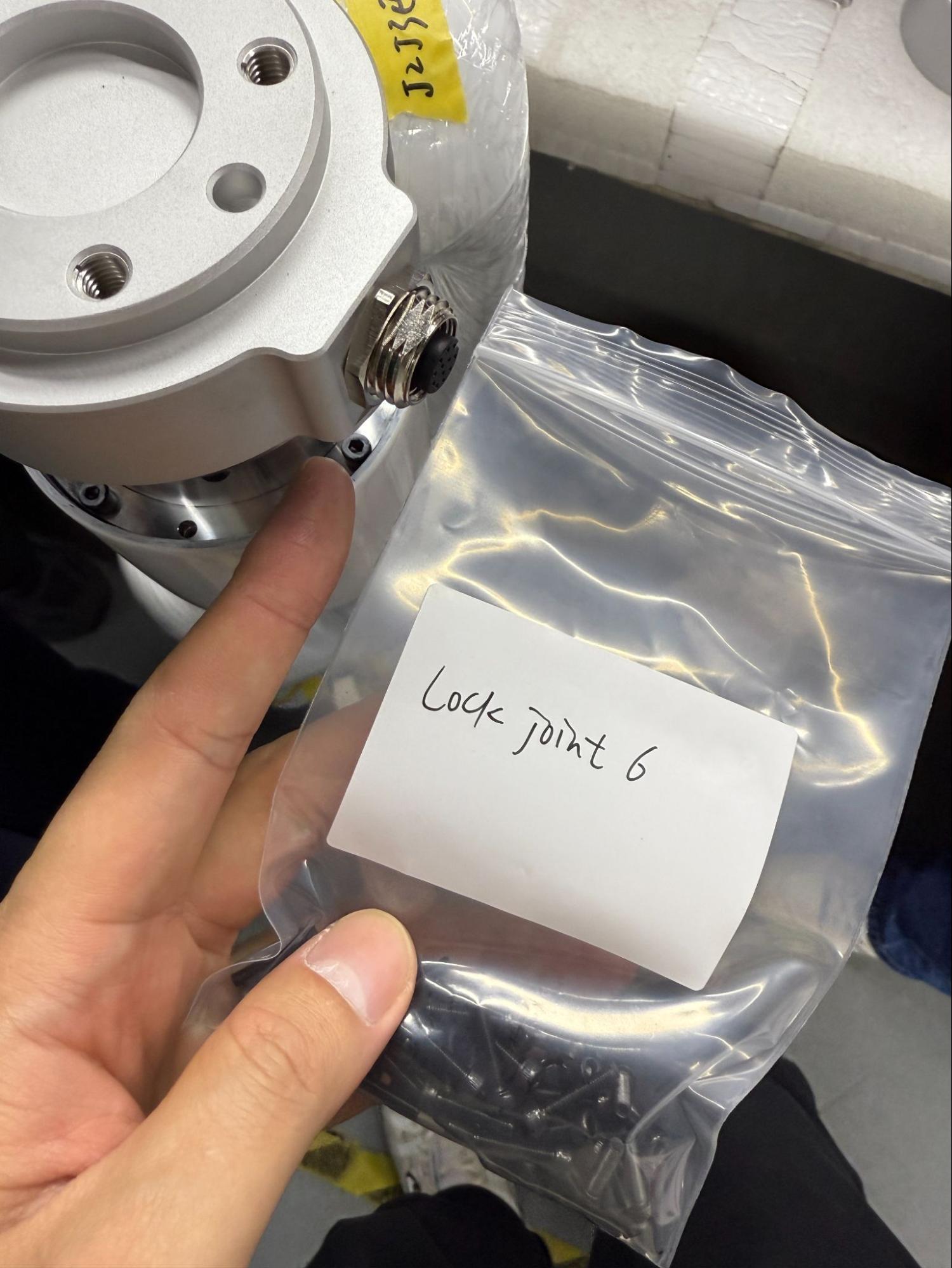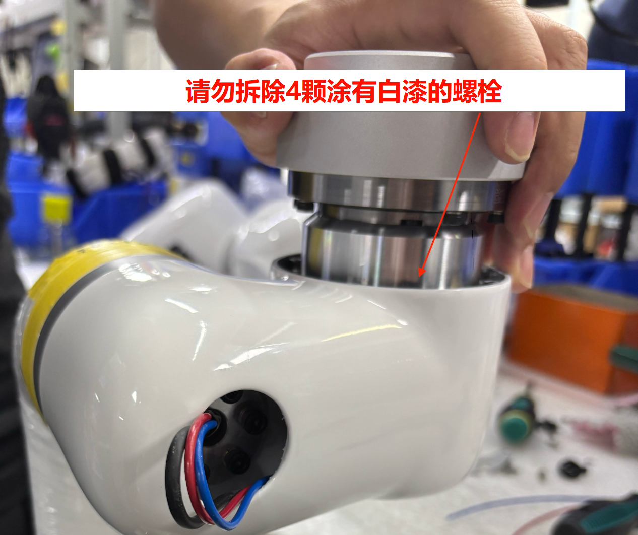 在螺栓上轻轻涂抹胶水,并将关节螺栓固定到位。再次确认末端法兰 IO 接口与先前标记的零点位置对齐——应在带有”UF”标志橡胶塞的一侧。