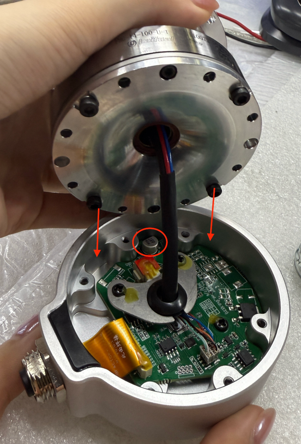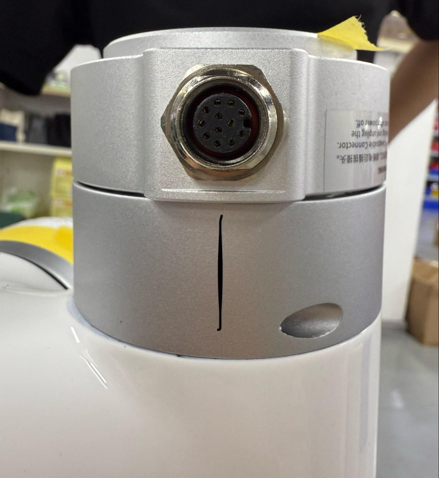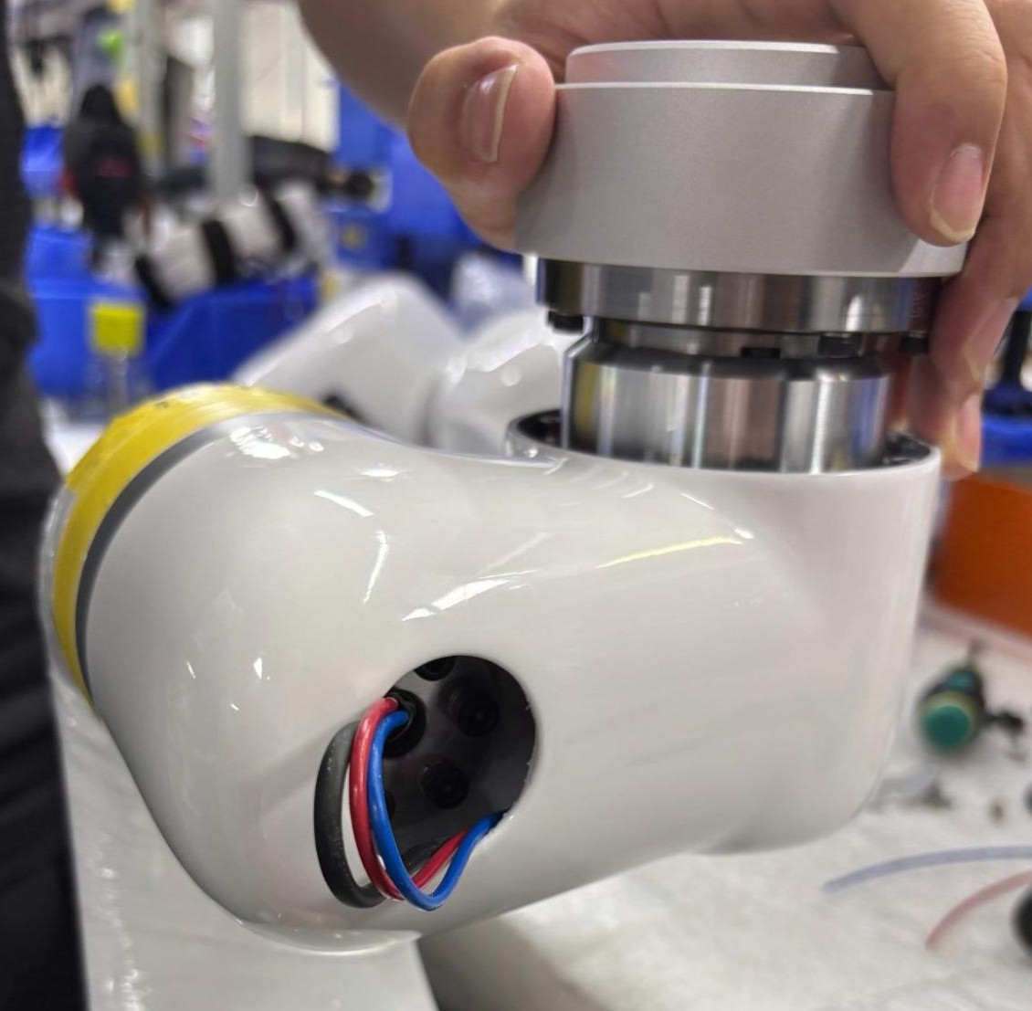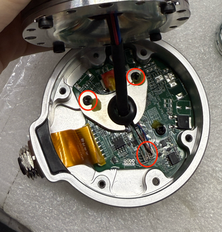 在螺栓上轻轻涂抹胶水,并将关节螺栓固定到位。再次确认末端法兰 IO 接口与先前标记的零点位置对齐——应在带有”UF”标志橡胶塞的一侧。