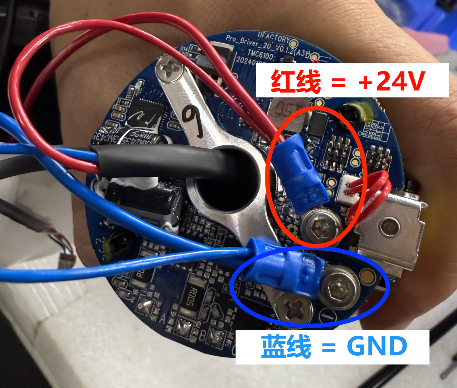 红色为 +24V,蓝色为 GND。剥去约 1cm 的线皮以便压接。最佳效果是确保金属线从蓝色压线端子中露出,靠近螺栓的圆孔。将它们固定到电路板上。