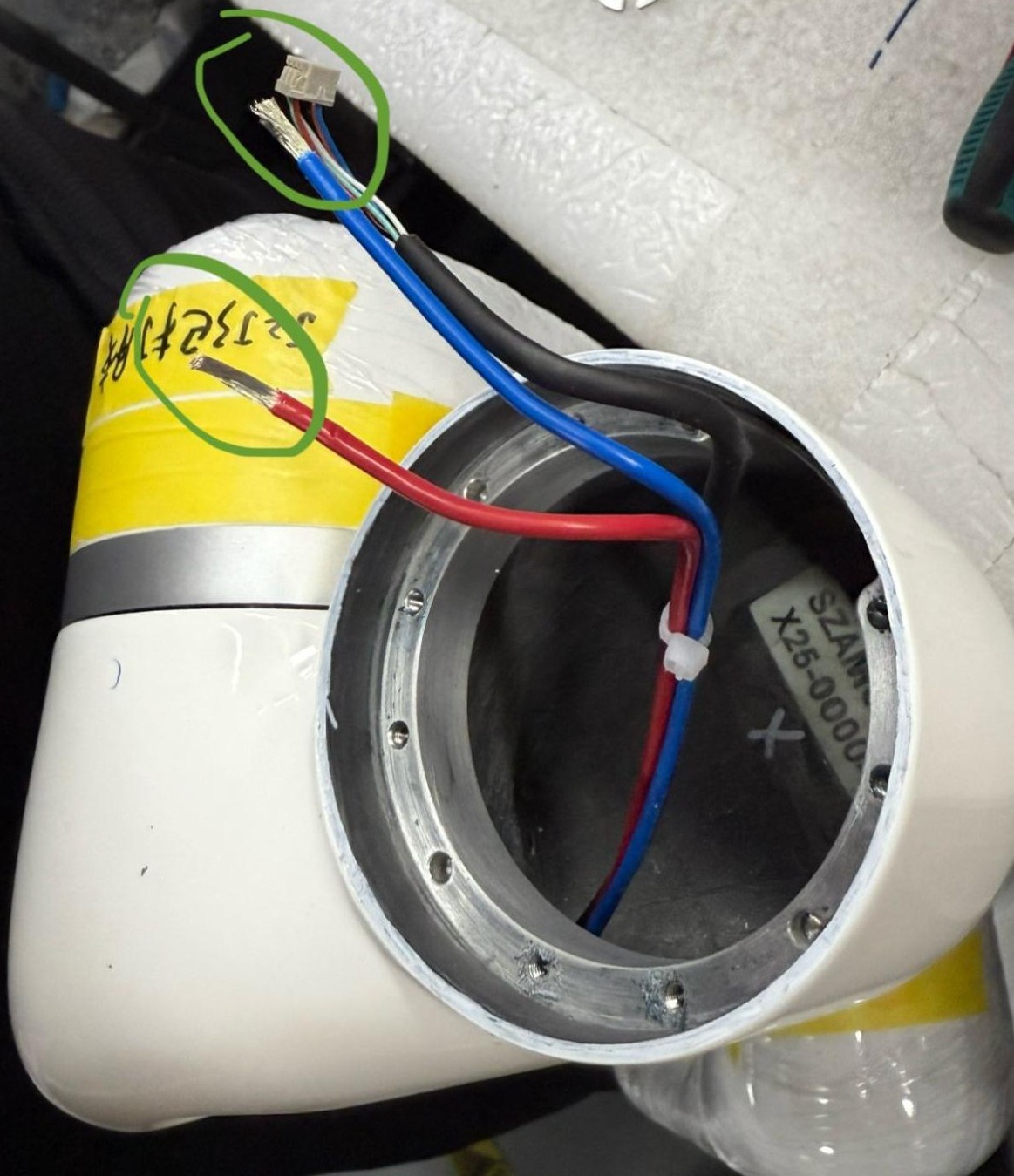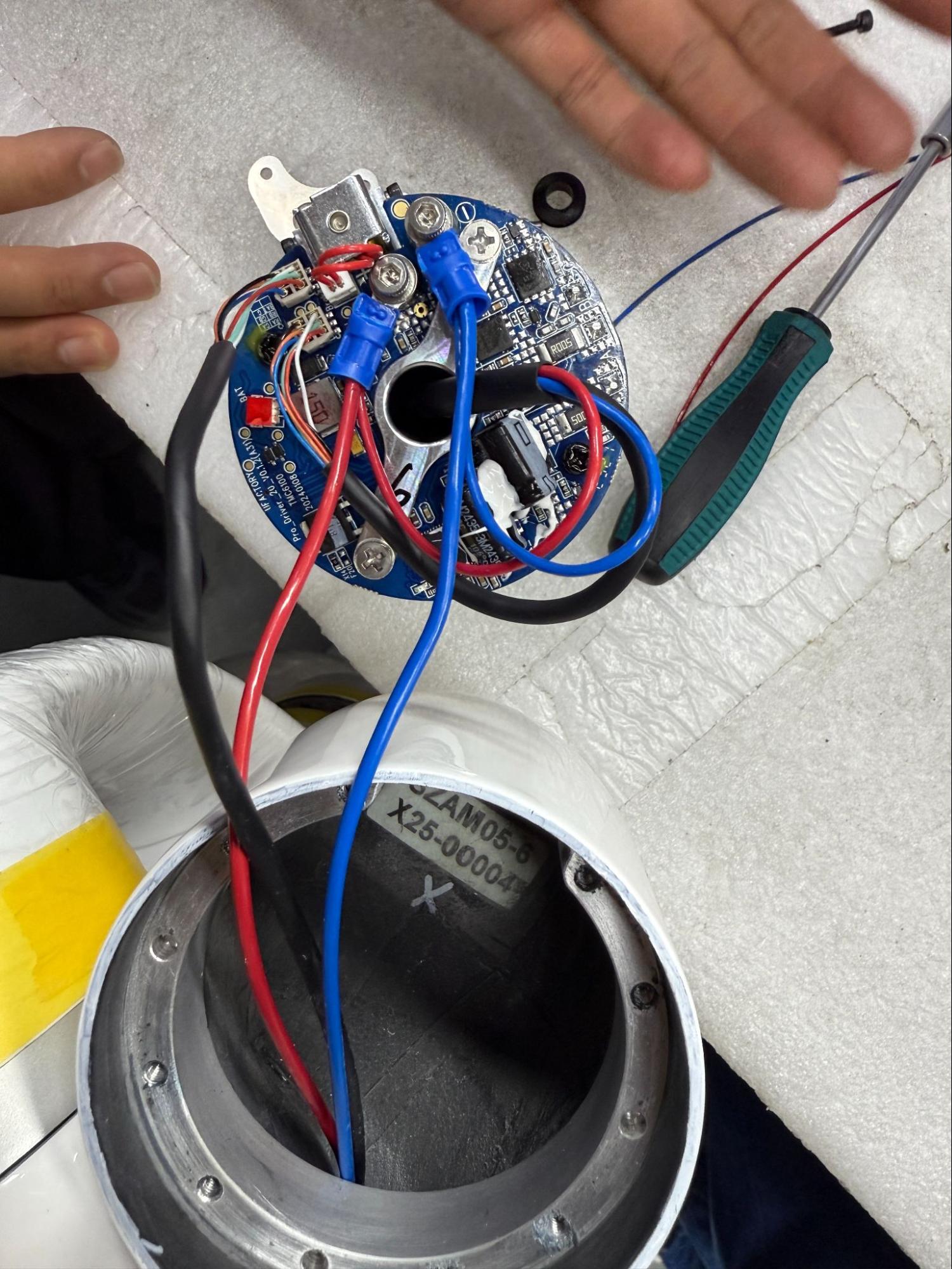 拧下金属回旋镖状部件上的两颗螺栓,并拔下彩色通信线和黑色软管包裹的电源线