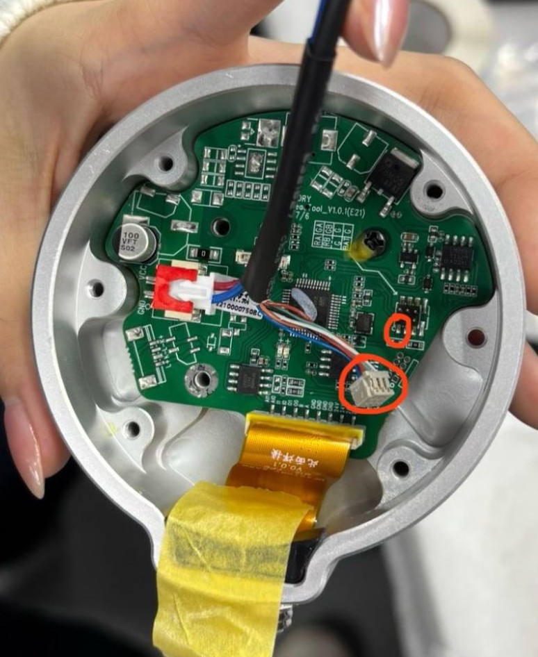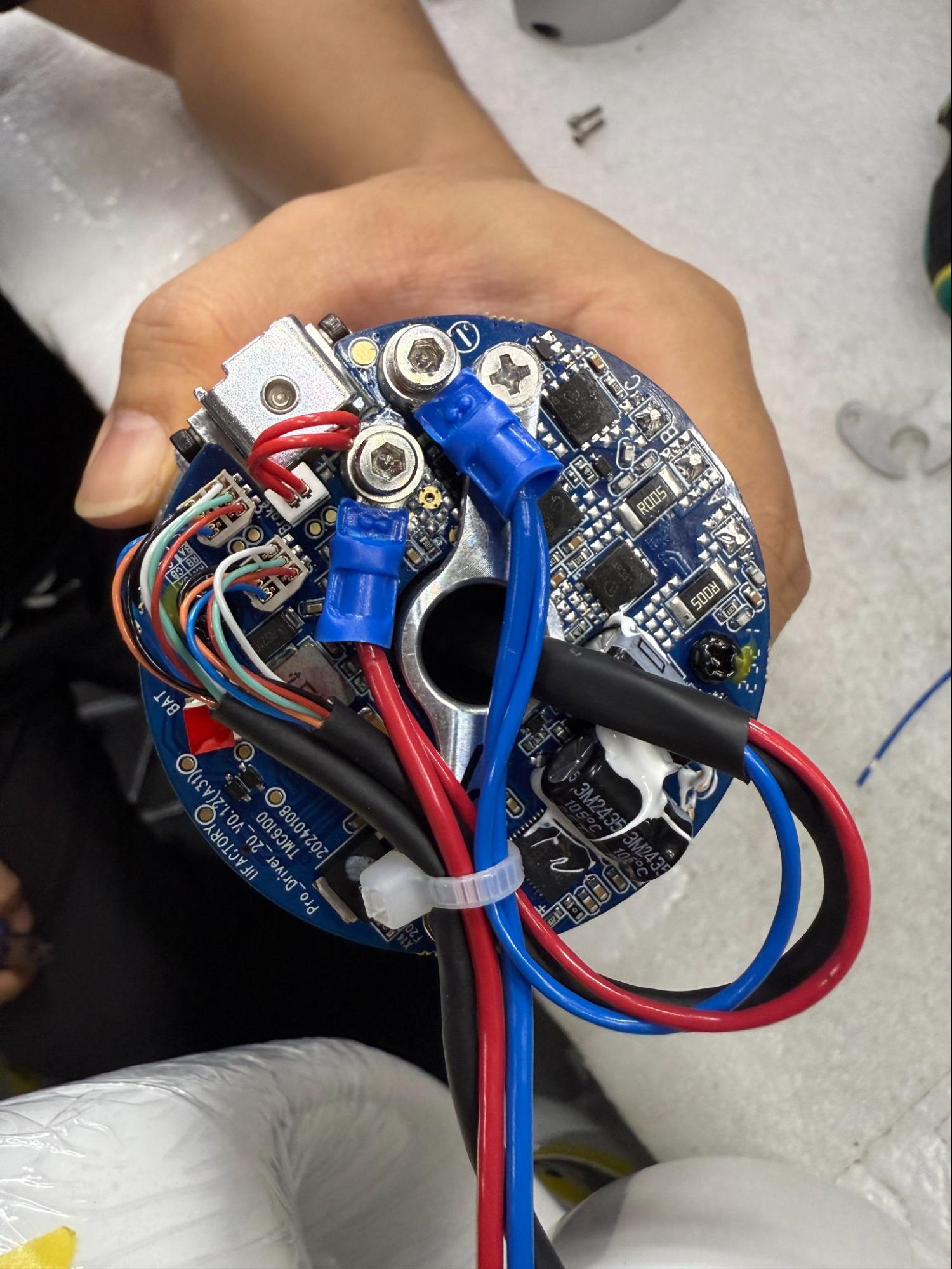 将黑色软管包裹的电源线插入对应端子。连接彩色通信线,注意其中红线必须与电路板上的半圆标记对齐。