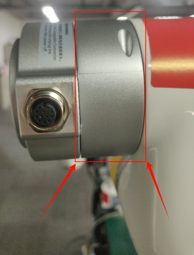 在更换末端法兰过程中,手臂最后一个关节的零点位置会丢失并需重置。在拆卸任何部件之前,需要标记在零点位置时末端法兰 IO 接口与手臂对准位置(应与带有”UF”标志橡胶塞处于同一侧),以防此位置信息丢失。